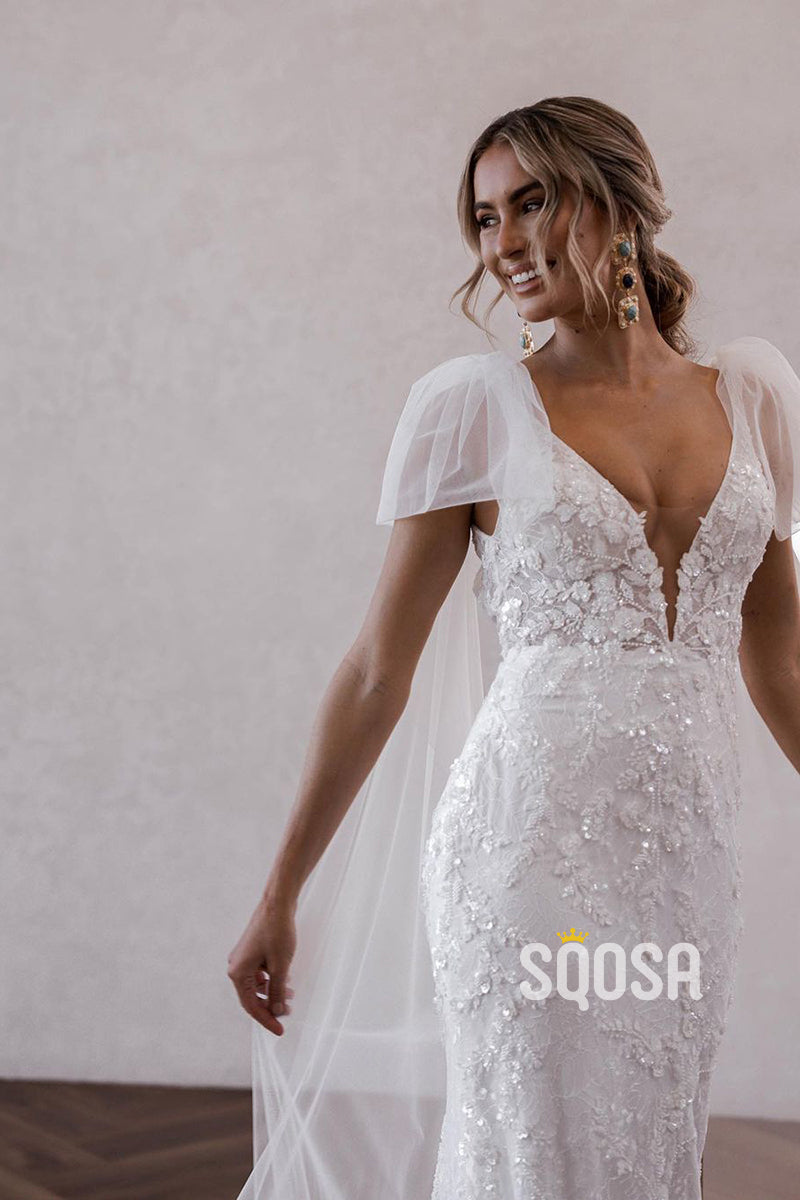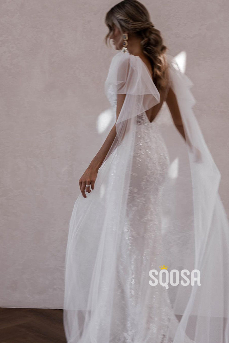 QW8008 - V-Neck Sheath Mermaid Applique Wedding Dresses With Shawl Bridal Gowns