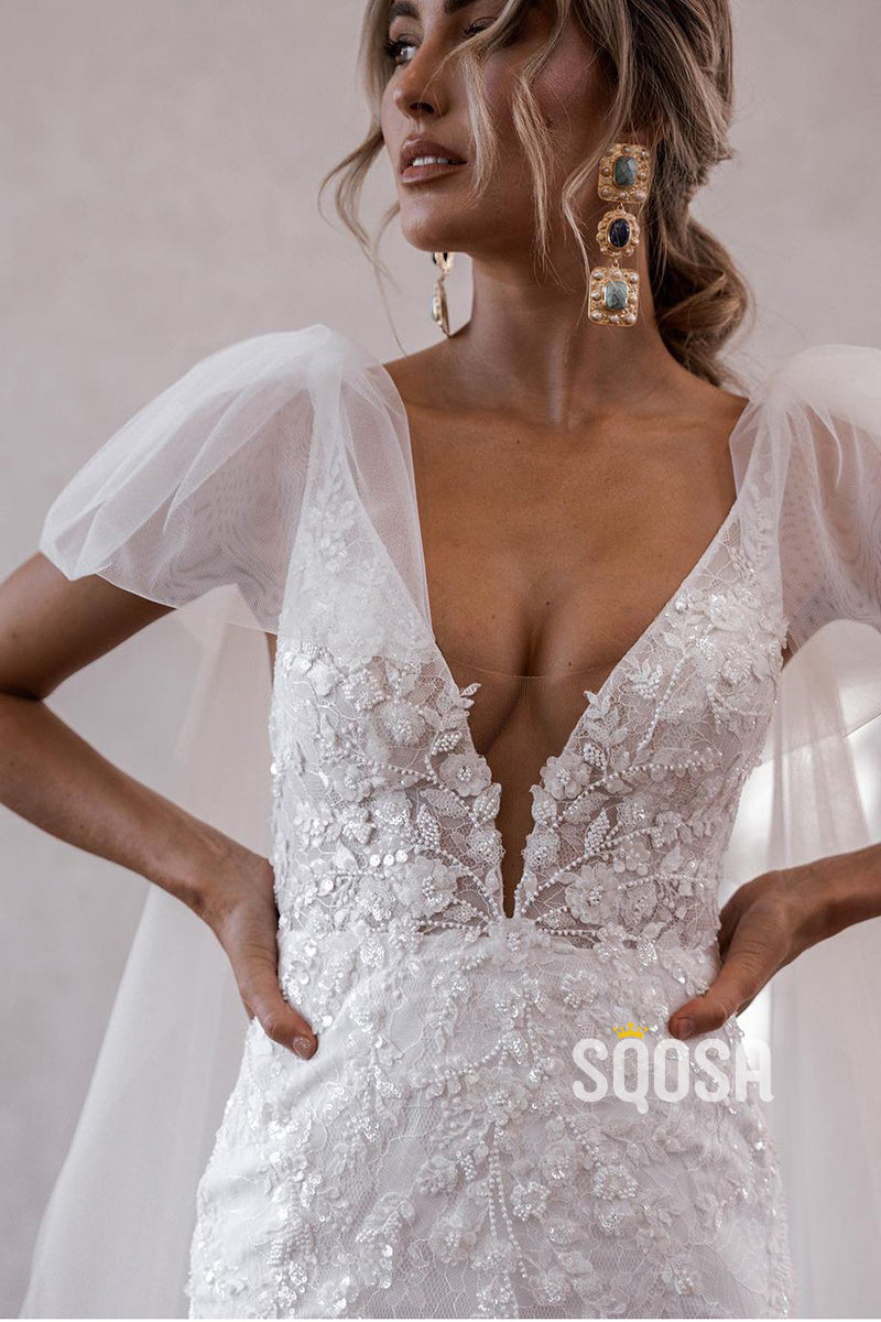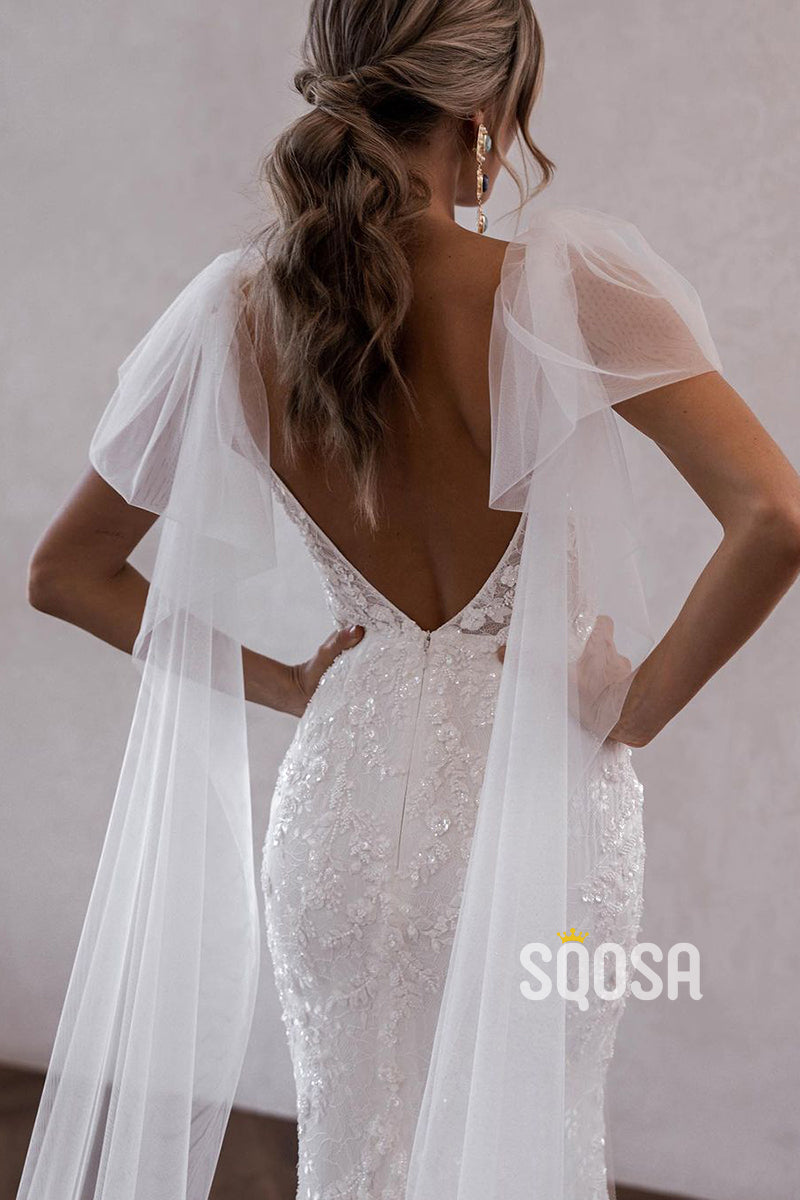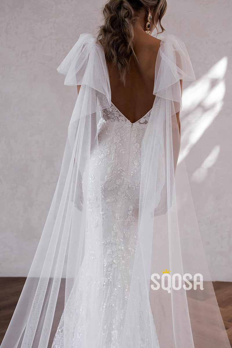QW8008 - V-Neck Sheath Mermaid Applique Wedding Dresses With Shawl Bridal