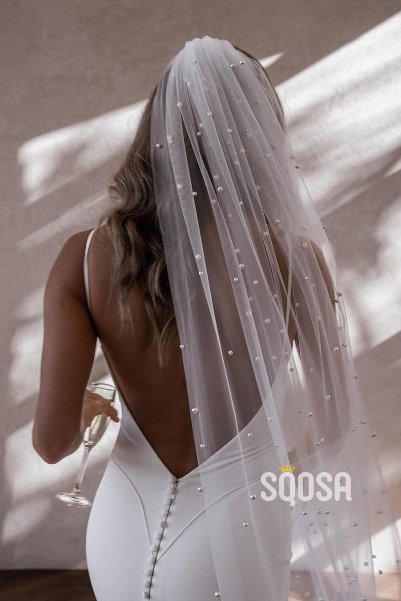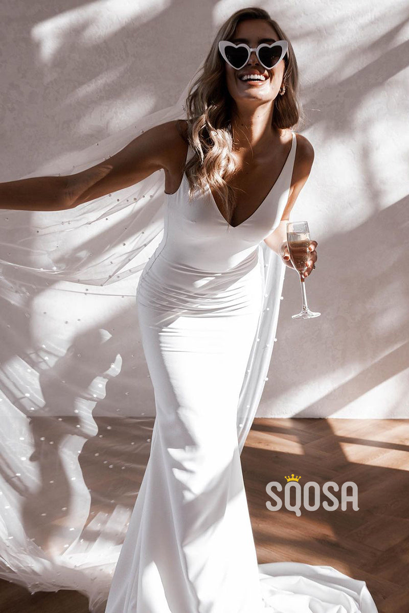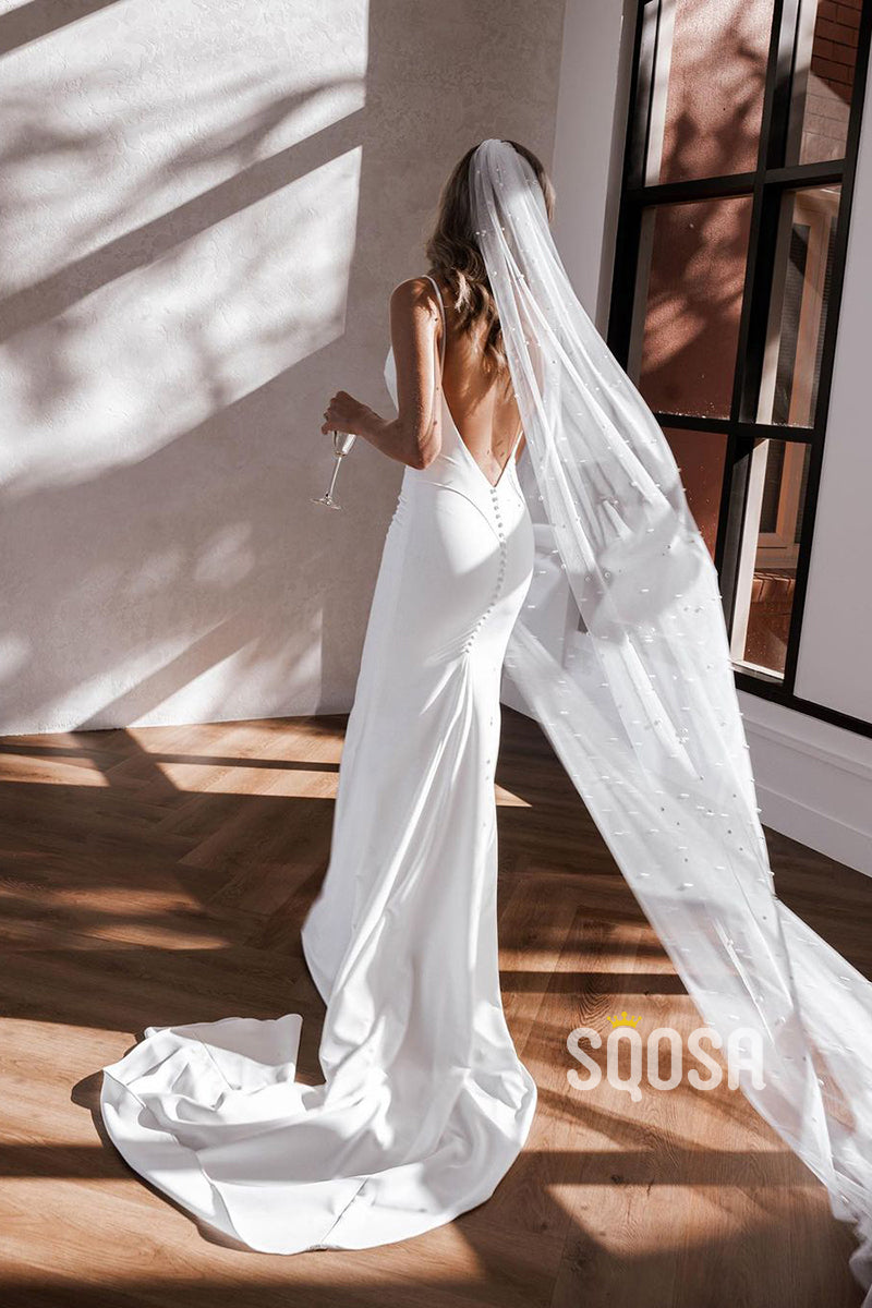 QW8010 - V-Neck Straps Saitn Train Casual Wedding Dress White Simple Bridal