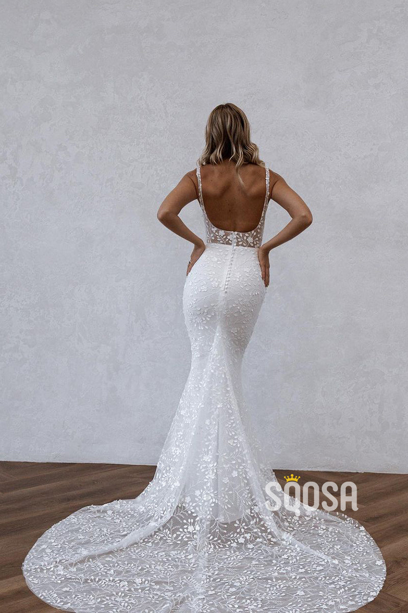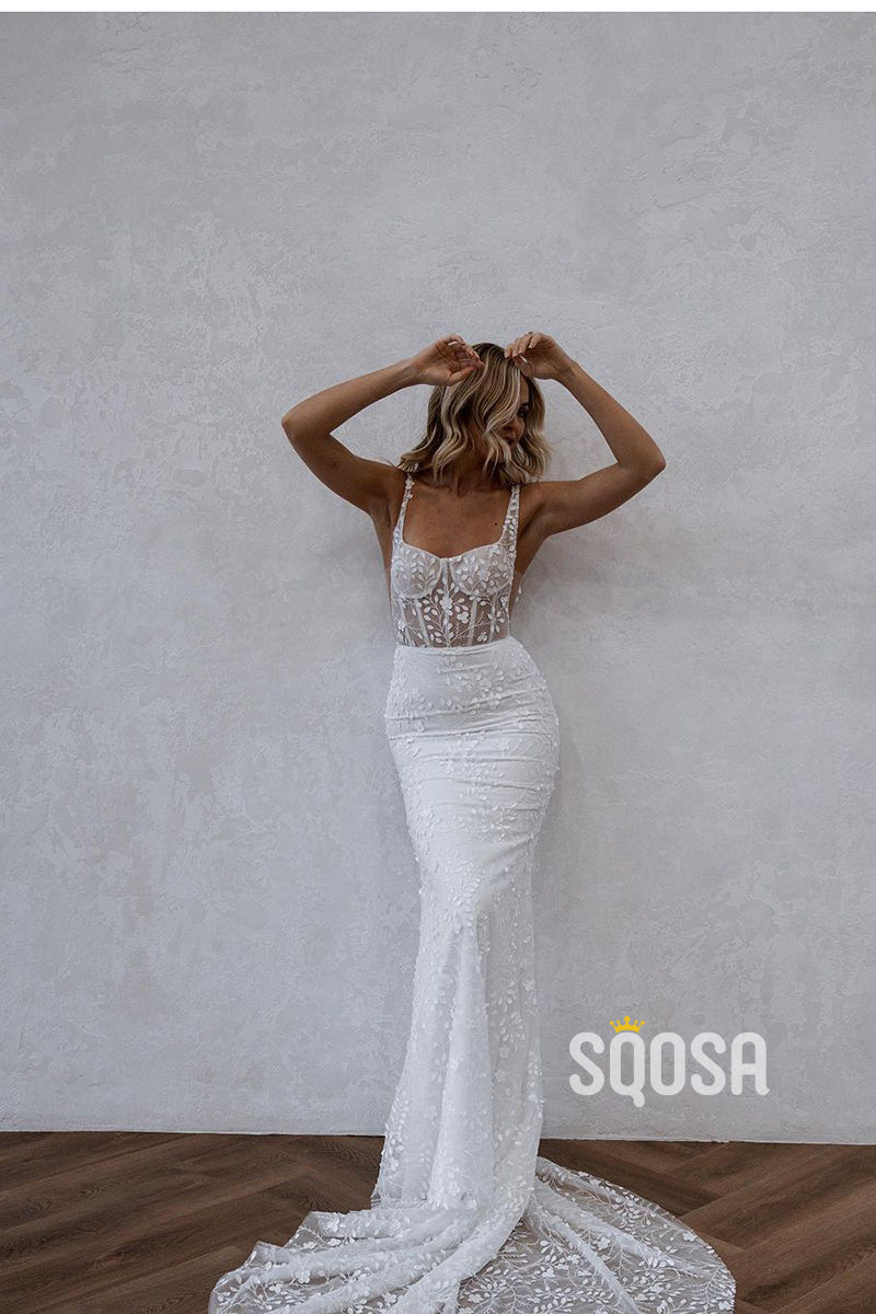 QW8012 - Sheath Mermiad Applique Sheeer Straps Wedding Boho Dresses Bridal Gowns