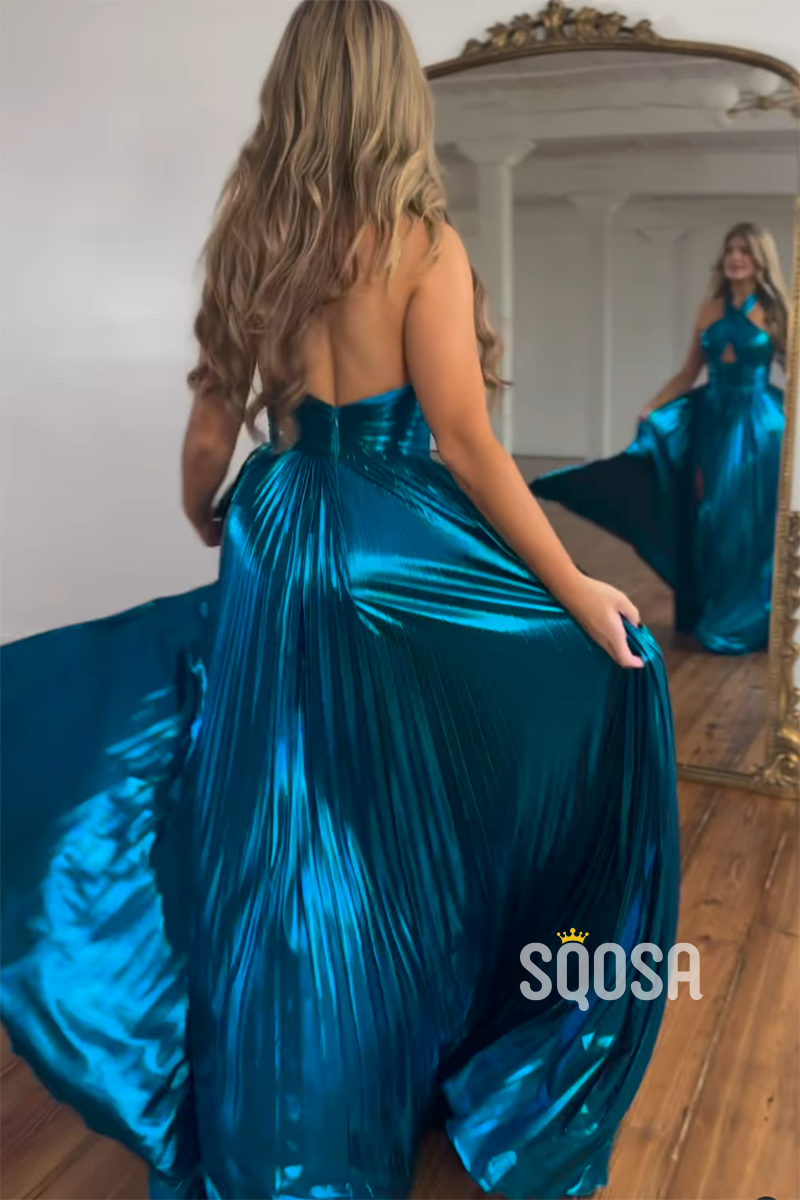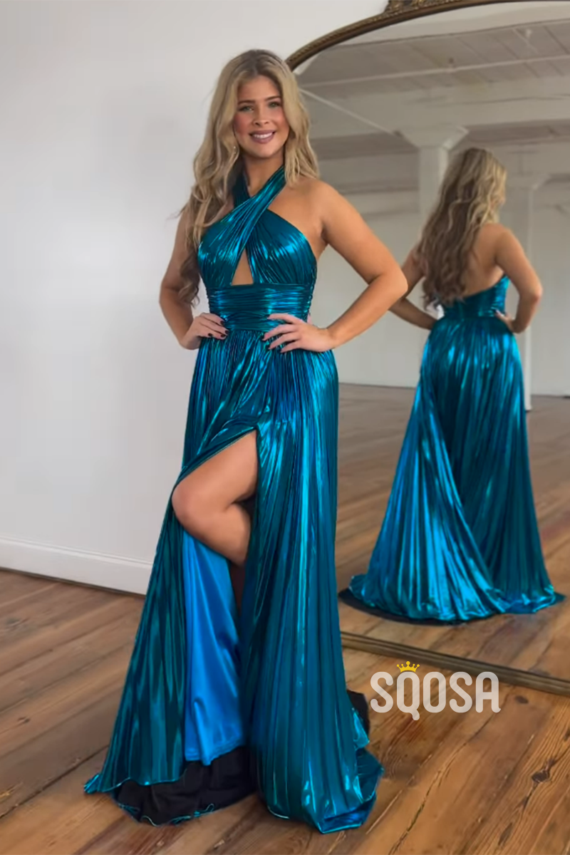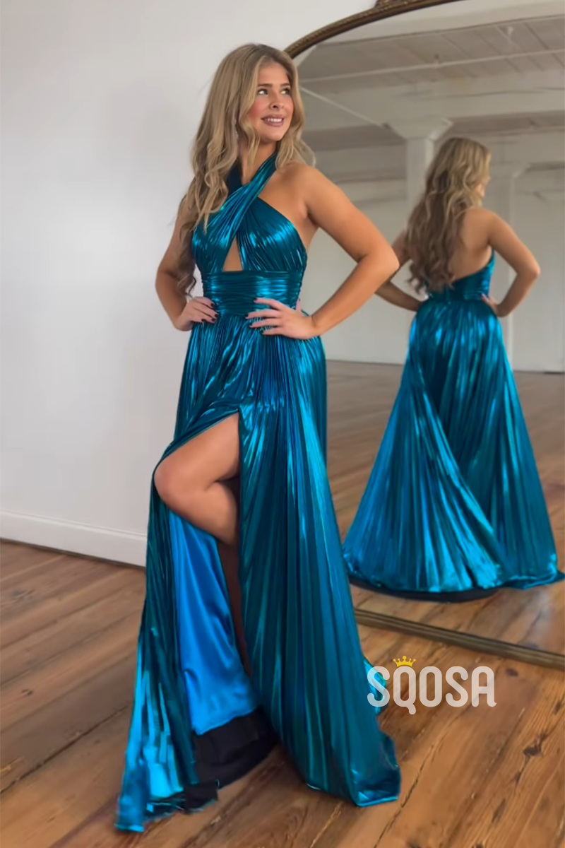 A-Line Navy Blue Satin Criss Cross Halter Long Prom Dress Evening Gowns QP0999B