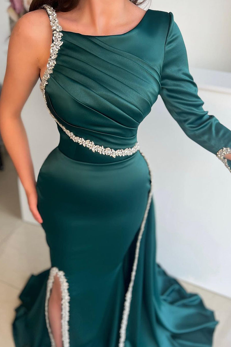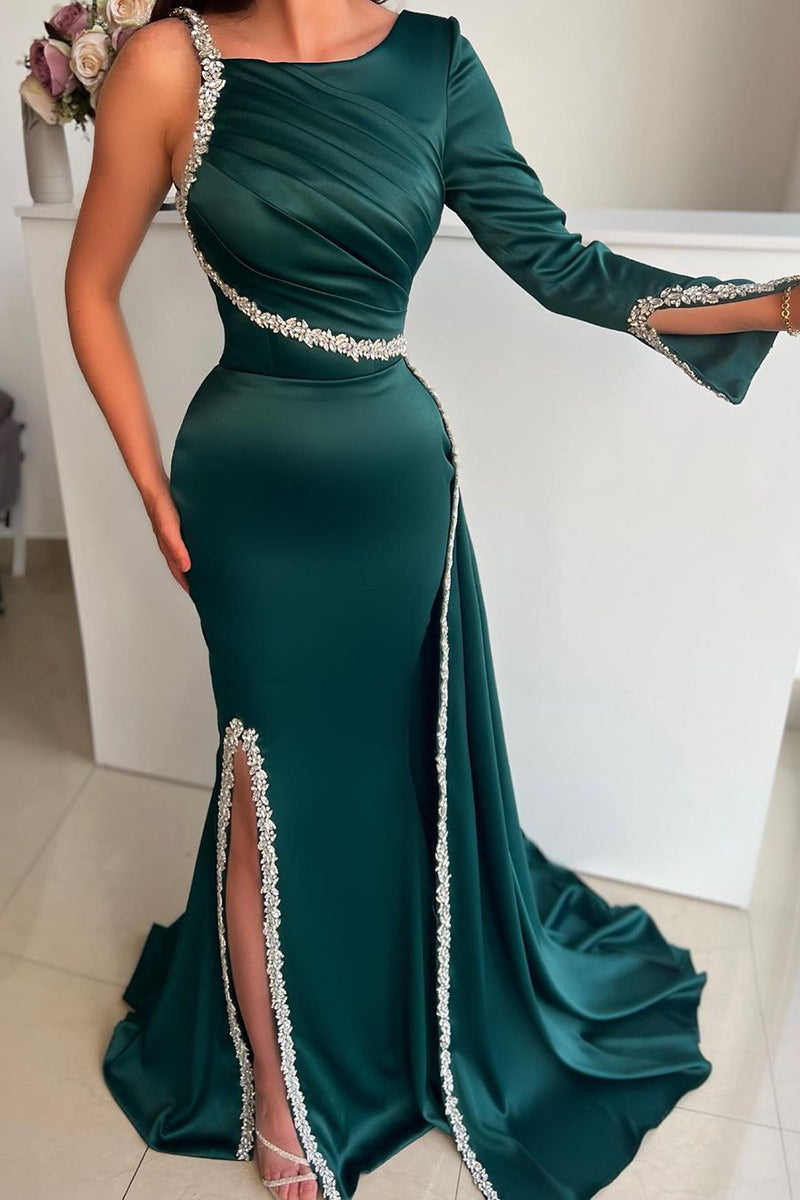 Unique Scoop Beads Long Sleeves Mermaid Formal Evening Dress with Slit