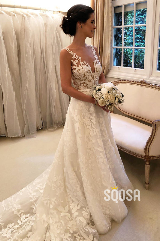 A Line V-neck Illusion Lace Wedding Dress with Slit Bridal Gown QW2386