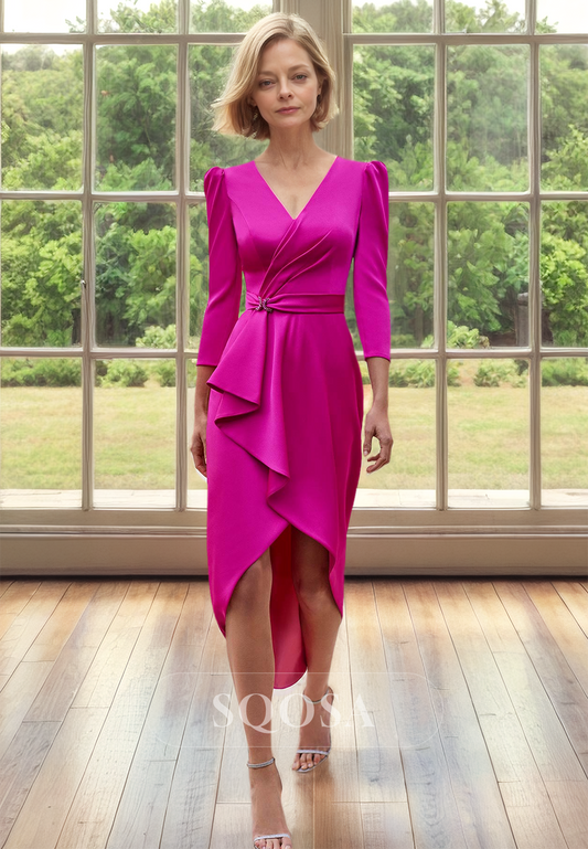 V-Neck Long-Sleeves High-Low Midi Mother of the Bride Dress Pleated Beaded Chiffon Cocktail Gowns