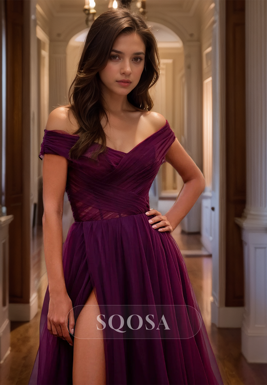 V-Neck Sleeveless Tulle A-Line Prom Dress Off-Shoulder Pleated High Slit with Train Formal Party Gowns