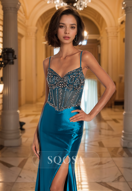 V-Neck Sleeveless Spaghetti Straps Sheath Train Prom Dress Slit Satin Formal Dress with Beaded