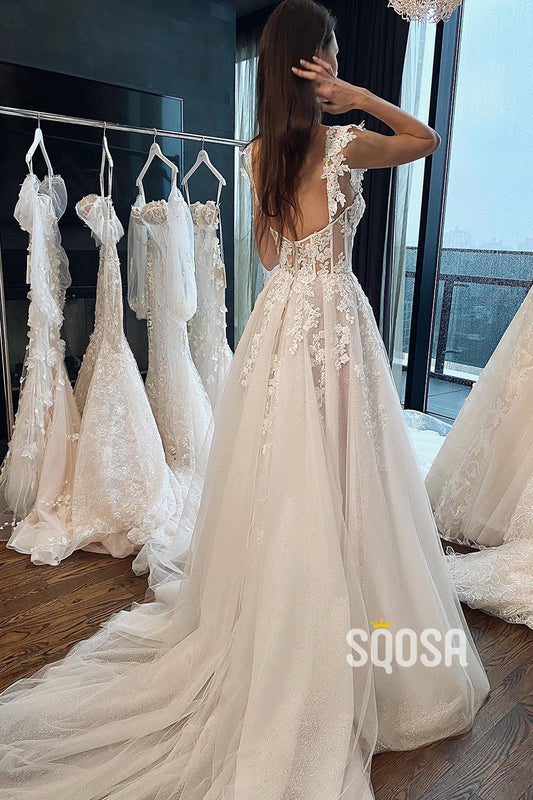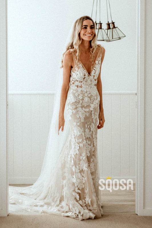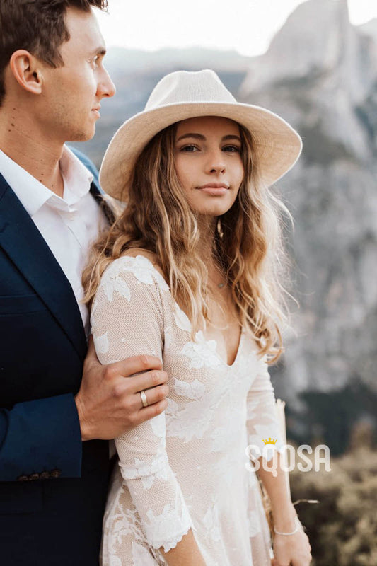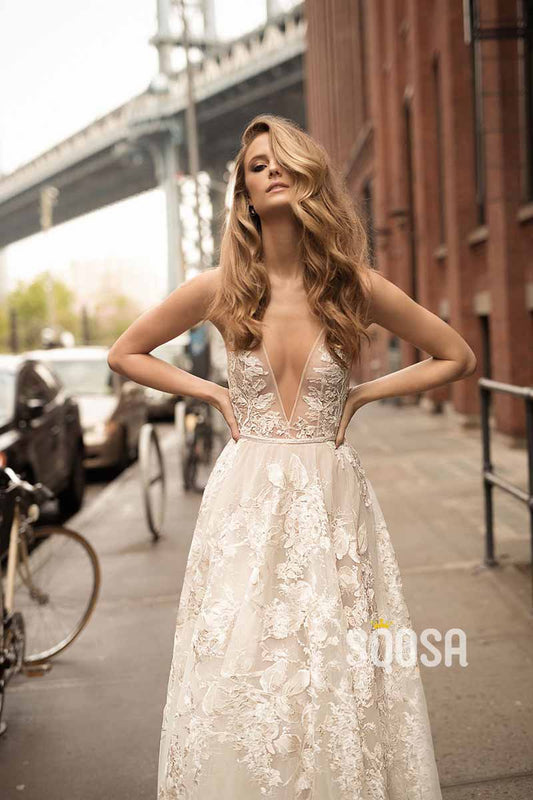 A-line V-neck Exquisite Lace Bohemian Wedding Dress Bridal Gowns QW2096