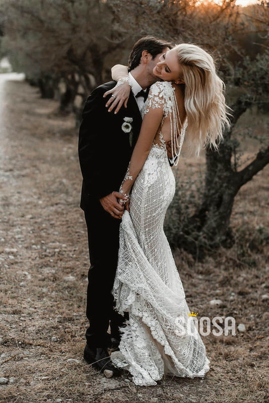 Attractive V-neck Lace Long Sleeves Mermaid Wedding Dress Backless QW2469