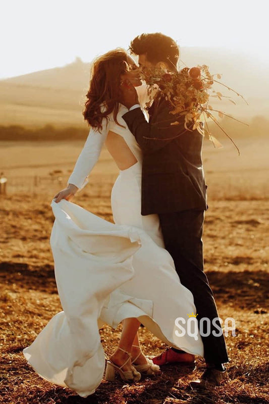 Sheath/Column Scoop Long Sleeves Bohemian Wedding Dress Backless QW2413