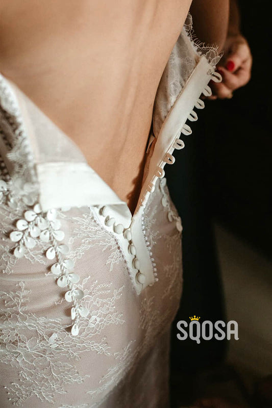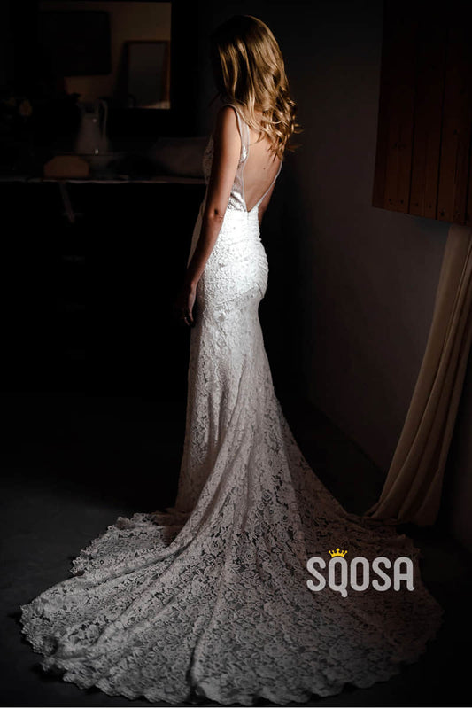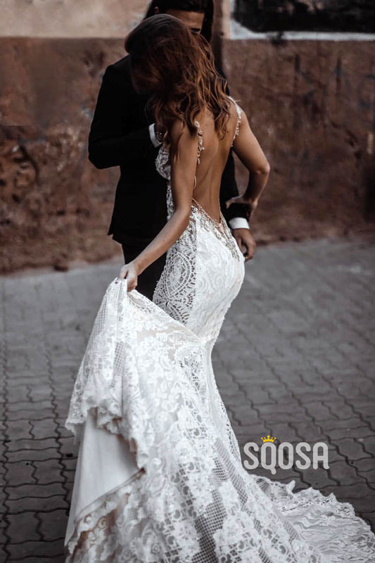 Sexy V-neck Ivory Lace Mermaid Wedding Dress Backless QW2499