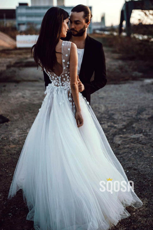 Illusion V-Neck Applliques Modest Tulle A-Line Rustic Wedding Dress Bohemian Wedding Gowns QW0859
