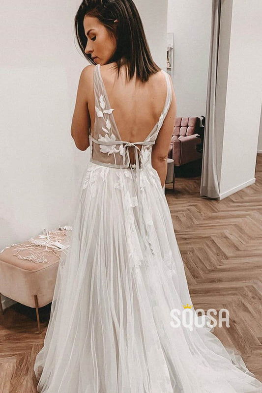 A-line Attractive V-neck Tulle Appliques Bohemian Wedding Dress QW2255