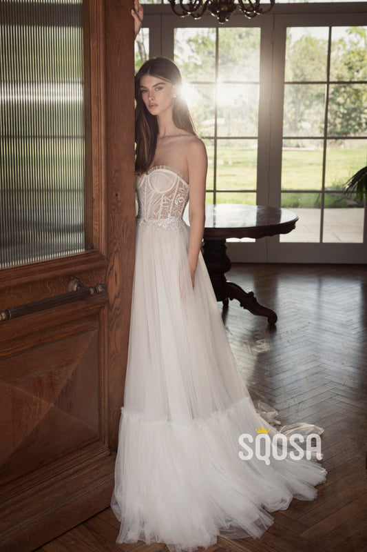 A-Line Strapless Applique Illuison Tulle Boho Wedding Dress Bridal Gown QW8019