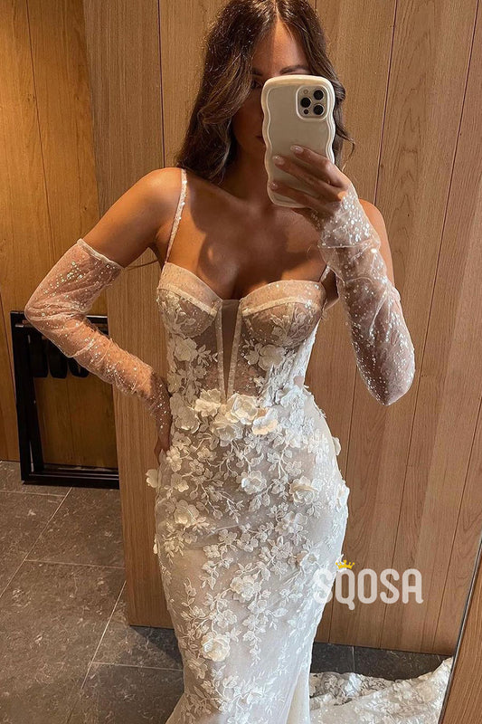 Sheath Mermaid Sweetheart Floral Illusion Sleeves Wedding Dress Bridal Gown QW8014