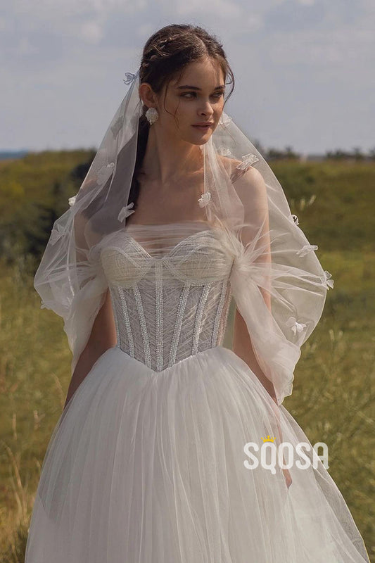 A-Line Straples Tulle Illusion Applique Casual Wedding Dress Bridal Gowns QW8046