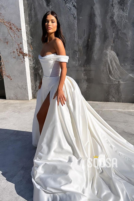 A-Line Detachable Off-Shoulder Satin Wedding Dress Bridal Gowns With Split QW8058