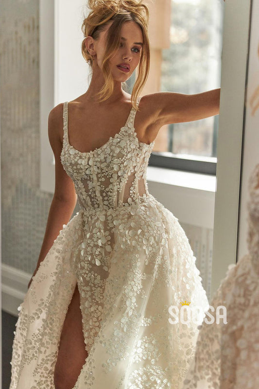 QW8001 - Sexy & Fitted Straps Applique High Slit Wedding Boho Dresses With Train Bridal Gowns