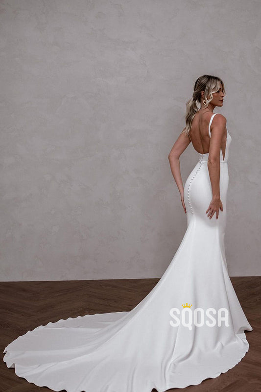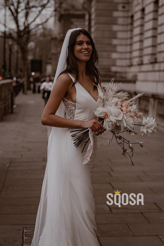 QW8009 - V-Neck Straps Mermaid Sheath Casual Wedding Dress White Simple Bridal Gowns