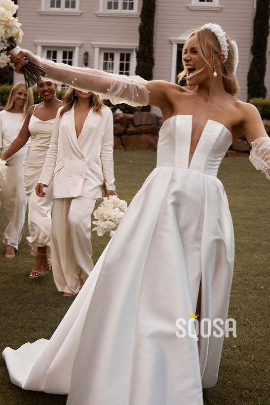A-Line V-Neck Strapless Satin Wedding Dress Bridal Gown With Slit QW8013