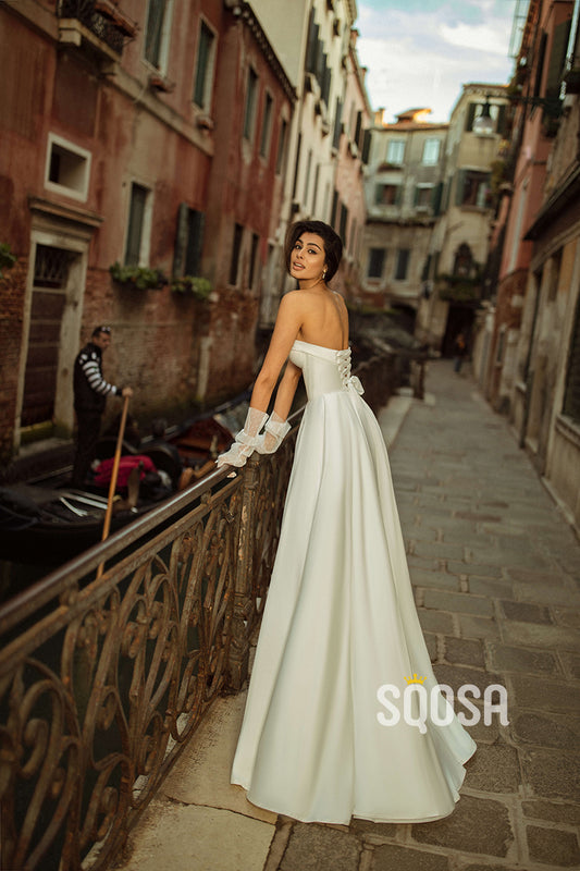 QW8004 - A-Line Strapless Satin Casual Wedding Dress White Simple Bridal Gowns