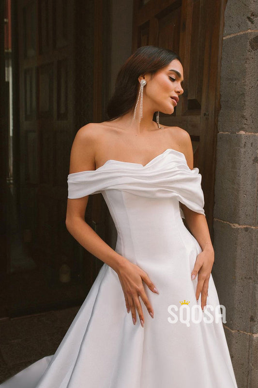 QW8000 - Elegant & Luxurious A-Line Off-Shoulder Beaded Satin White Simple Bridal Gowns