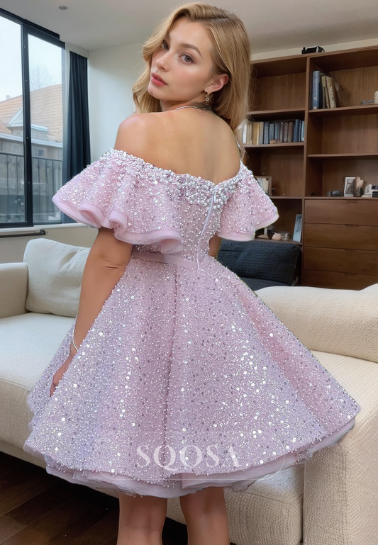 A Line Off Shoulder Sequins Appliques Red Homecoming Dress Short Prom Dress
