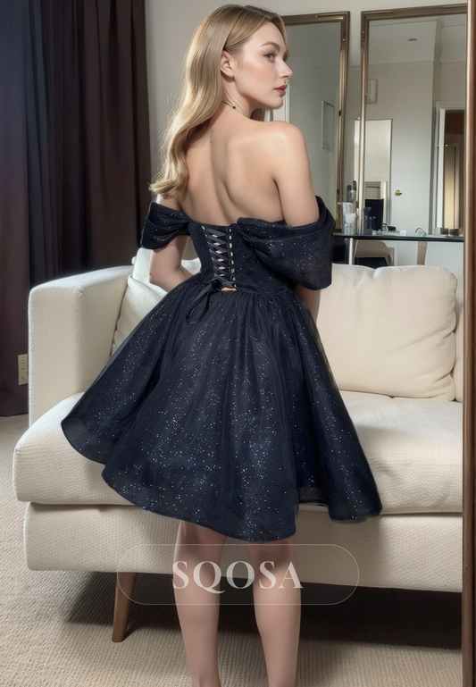 A Line Off Shoulder Sequins Appliques Navy Homecoming Dress Short Graduation Dress