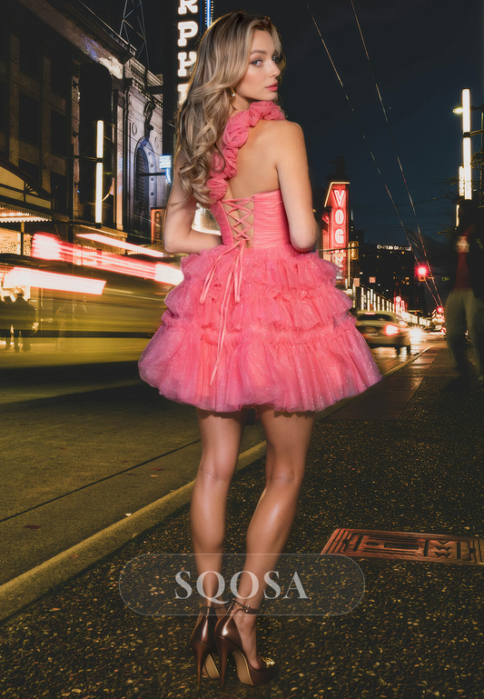 Unique Halter V Neck Lace Appliques Pink Homecoming Dress Short Graduation Dress