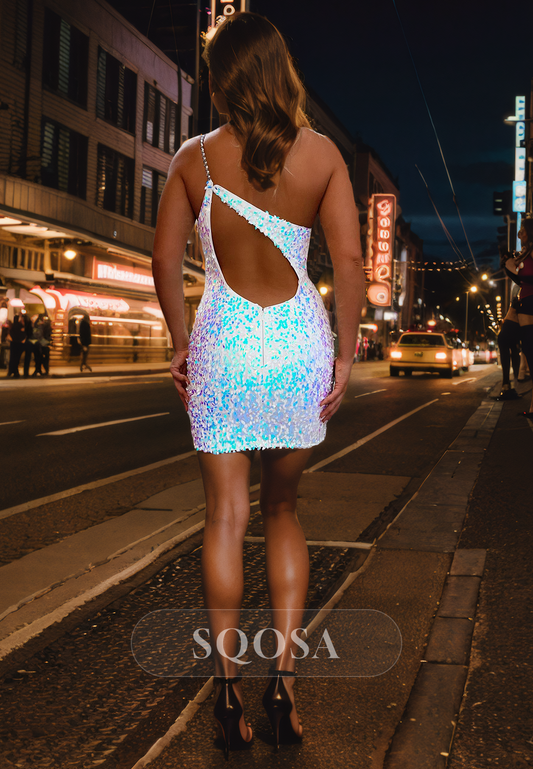 Unique One Shoulder Sequins Short Homecoming Dress Tight Graduation Dress