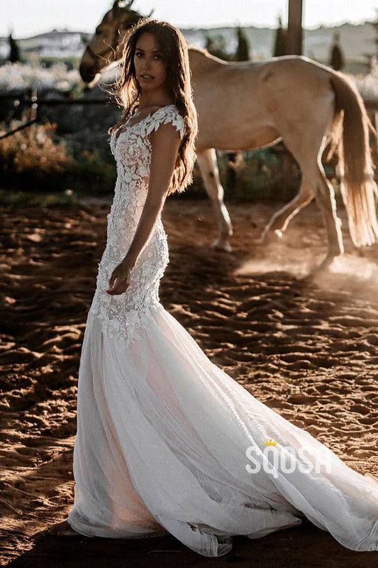 Deep V-Neck Cap-Sleeves Sweep Train Mermaid Prom Dress Lace Applique Cutout Bride Gowns