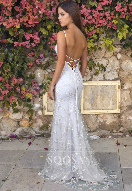 Deep V-Neck Spaghetti Straps Mermaid Boho Wedding Dress Floor-Length Lace Beach Dress with Appliques