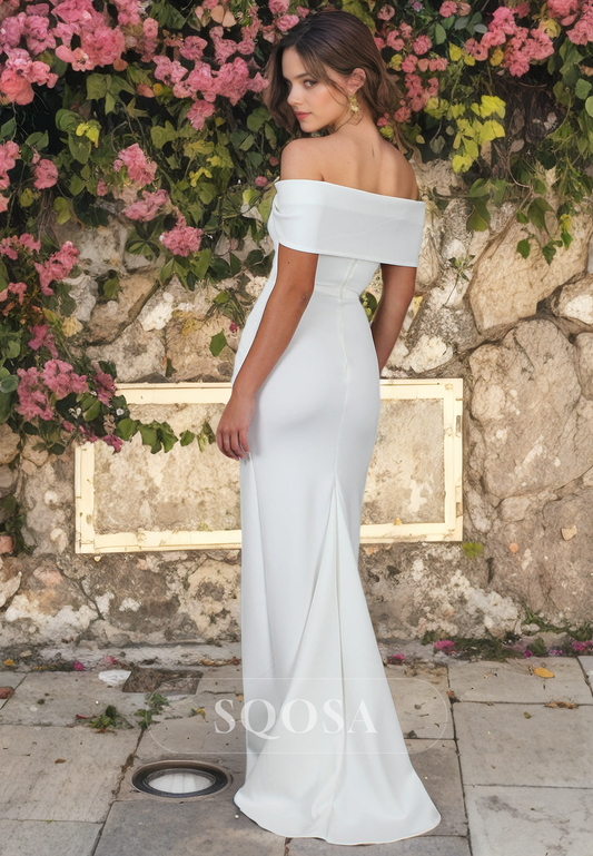 Off-Shoulder Long Sleeves Mermaid Beach Wedding Dress Pleated Satin Slit Boho Bridal Dress