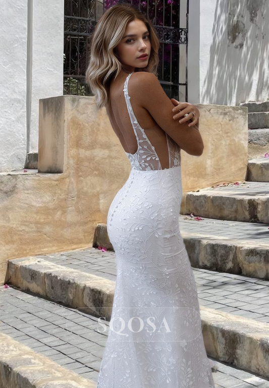 V-Neck Spaghetti Straps Mermaid Wedding Dress with Train Sleeveless Lace Bridal Dress
