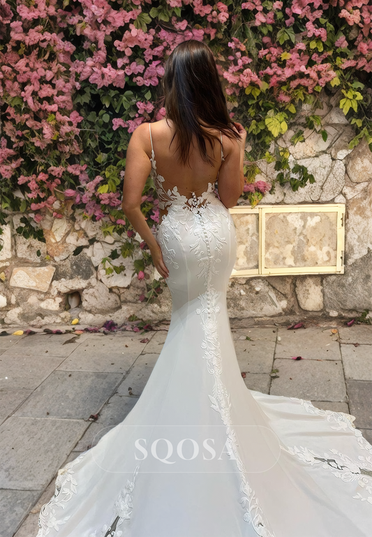 Appliques with Sweep Train Bridal Gowns V-Neck Spaghetti Straps Satin Mermaid Wedding Dress