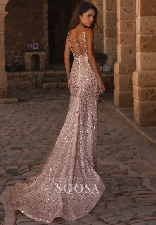 Deep V-Neck Spaghetti Straps Mermaid Wedding Dress Glitter-Knit High Slit with Train Bridal Dress