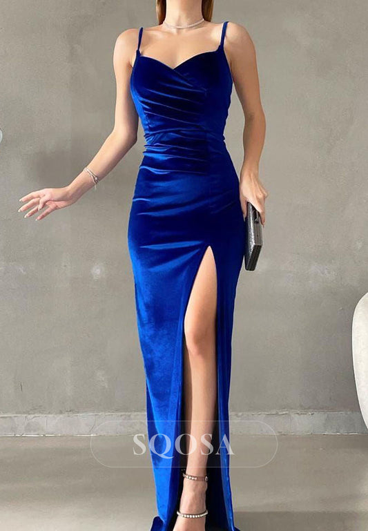 Simple Sweetheart Spaghetti Straps Sleeveless Pleated Floor-Length High Slit Mermaid Prom Dress