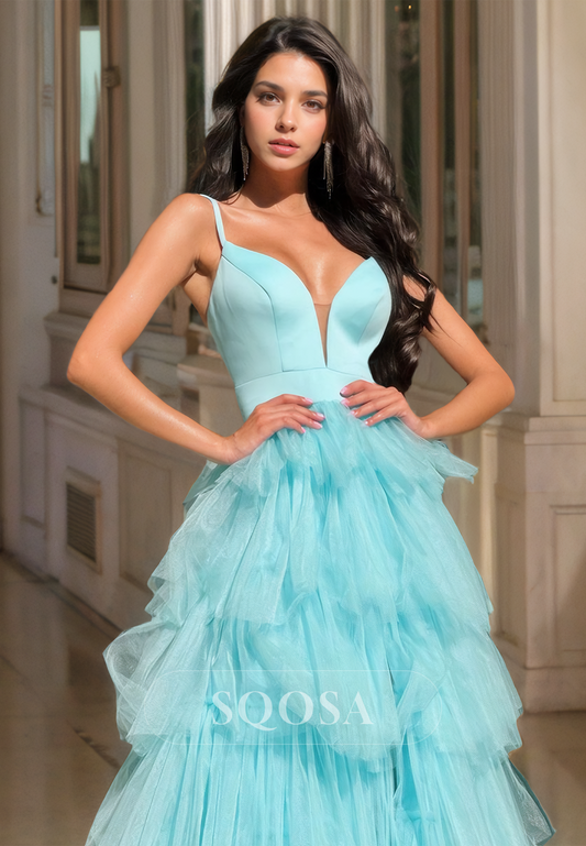 Spaghetti Straps V-Neck Tulle A-Line Prom Dress Sleeveless Beaded Pleated Sheer Formal Gowns