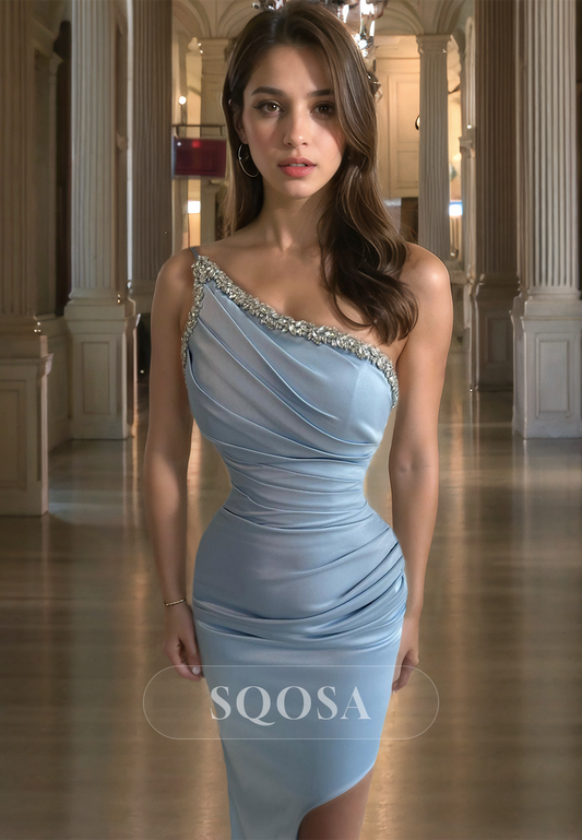 Beaded Asymmetrical-Neck Sleeveless Pleated Floor-Length Mermaid Formal Prom Dress with High Slit