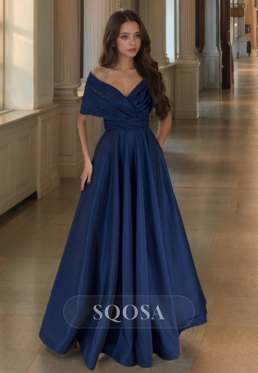Simple Deep V-Neck Pleated A-Line Formal Gowns Sleeveless Off-Shoulder Slit Train Prom Dress