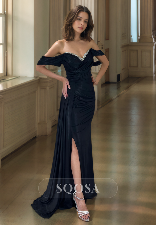 Beaded V-Neck Off-Shoulder Mermaid Party Gowns Sleeveless Pleated High Slit Prom Dress with Sweep Train