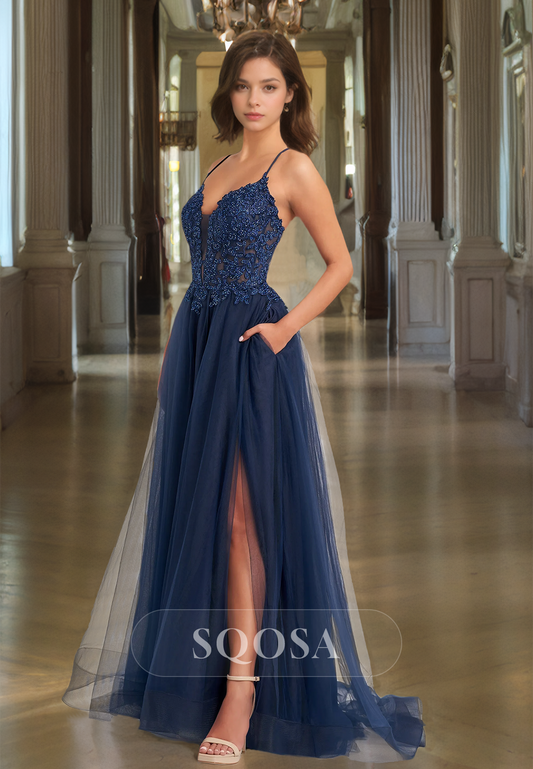 Spaghetti Straps Sweetheart Cutout A-Line Prom Dress Applique Pleated High Slit Tulle Evening Gowns
