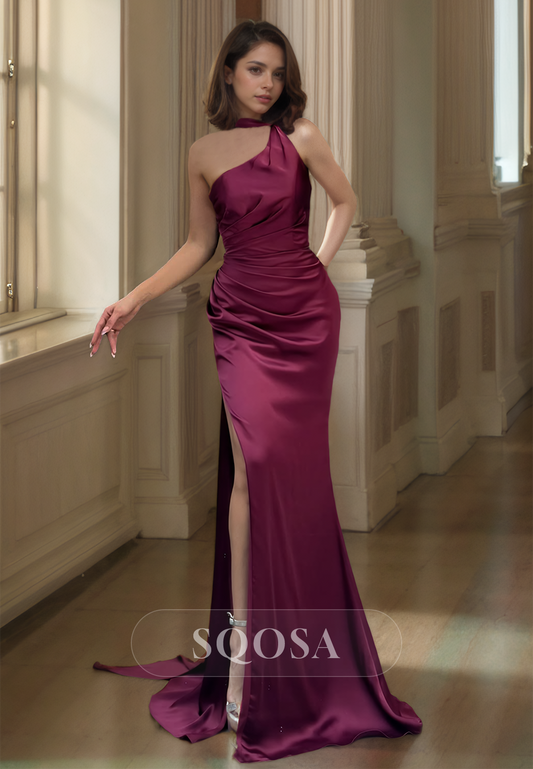 Asymmetrical Halter-Neck One-Strap Sleeveless Pleated Satin Mermaid Prom Dress with High Slit