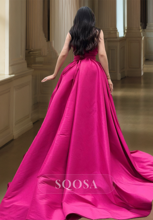Sweetheart Sleeveless High Slit Train Dinner Gowns Pleated Floral Embellished Satin A-Line Prom Dress