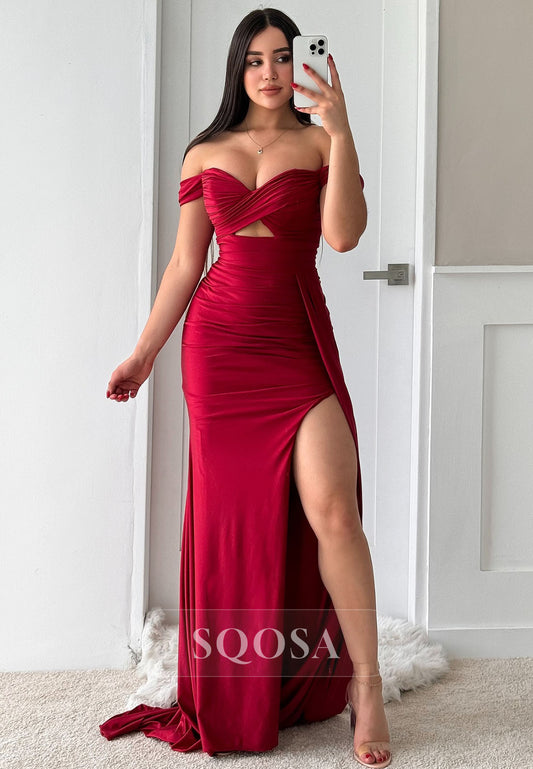 Off-Shoulder Sleeveless Pleated Mermaid Formal Gowns Sweetheart Slit Train Satin Prom Dress