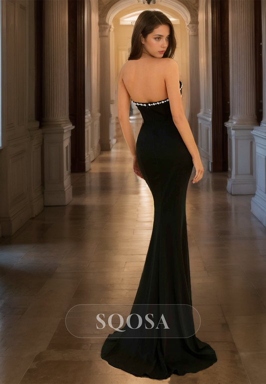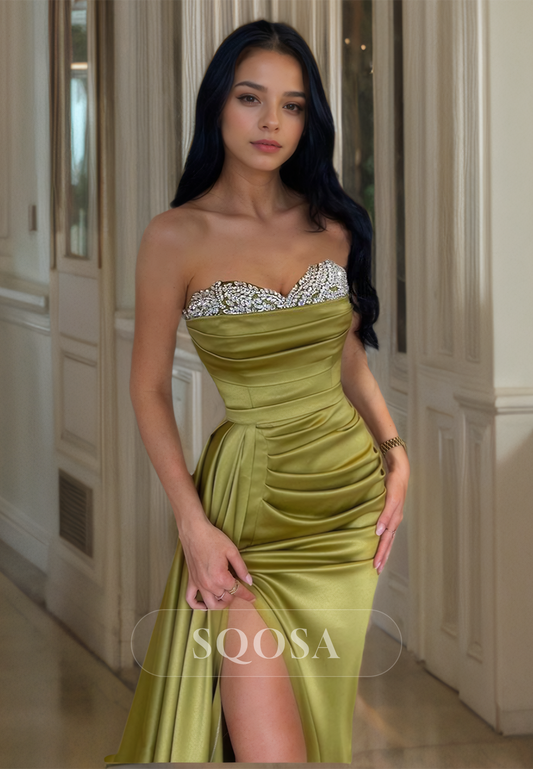 Beaded Sweetheart Strapless Mermaid Prom Dress Sleeveless Pleated Party Gowns with High Slit