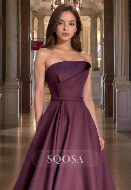 A Line Strapless Satin Pleats Long Prom Formal Dress with Pockets QP1081