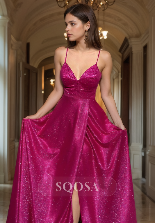A-Line Spaghetti Straps V-Neck Off-Shoulder Glitter-Knit Pleated Prom Dress with High Slit