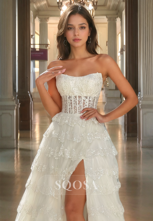 A-Line Sweetheart Off-Shoulder Sleeveless Pleated Tiered Sparkly Long Formal Prom Dress with High Slit