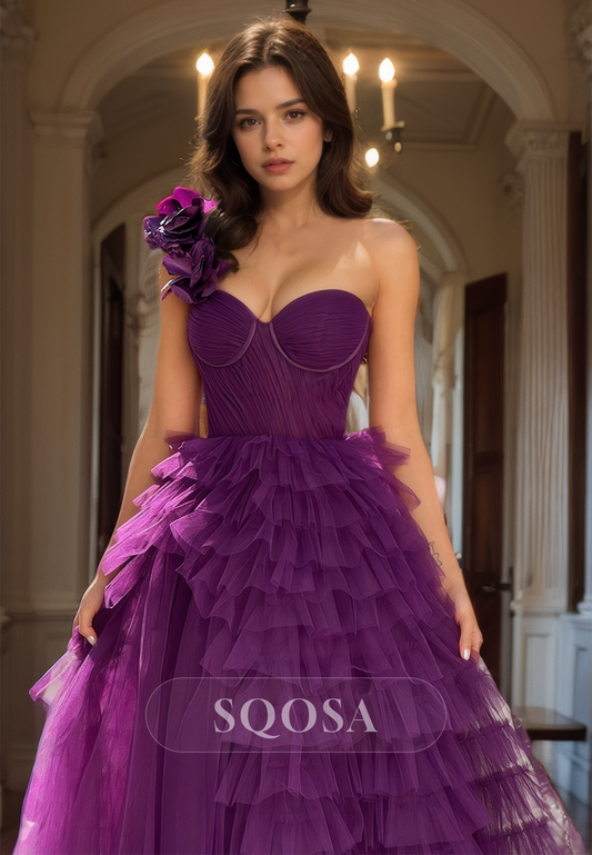 Off-Shoulder Sweetheart Sleeveless Tulle Formal Gowns Floral Embossed Pleated Tiered A-Line Prom Dress
