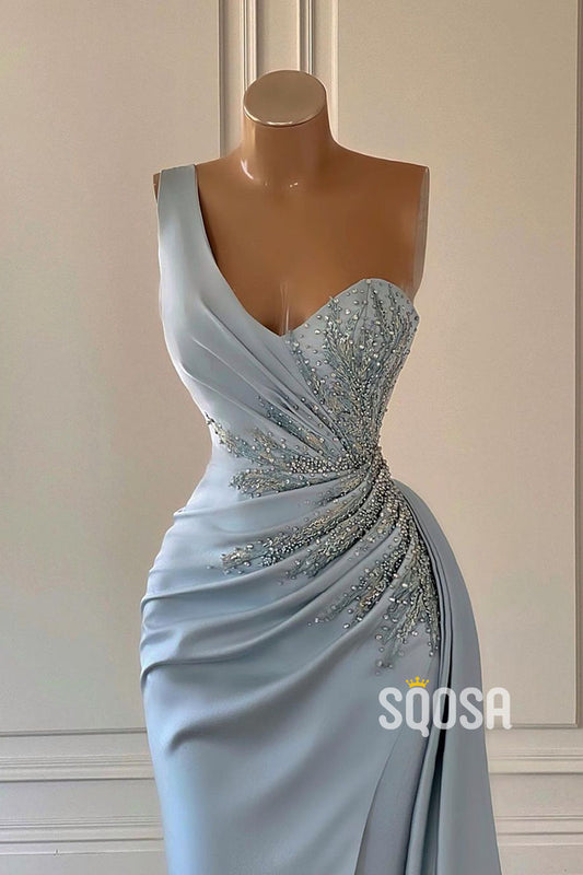 Sheath/Column One Shoulder Beaded Pleats Long Prom Dress Evening Gown QP2354